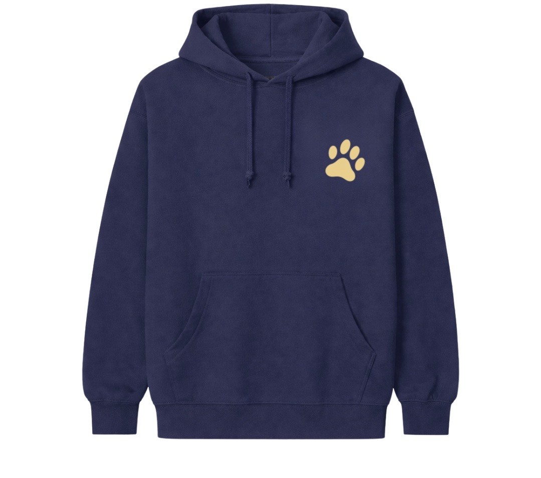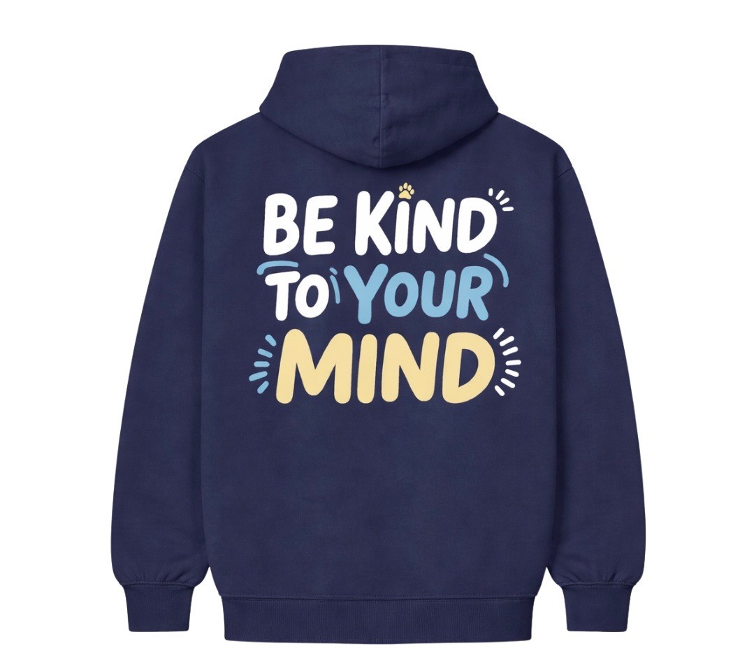 A navy blue heavyweight hoodie with a silk screen design on the back with a message to “Be Kind to Your Mind” along with a small paw print on the front to add a Butler twist.